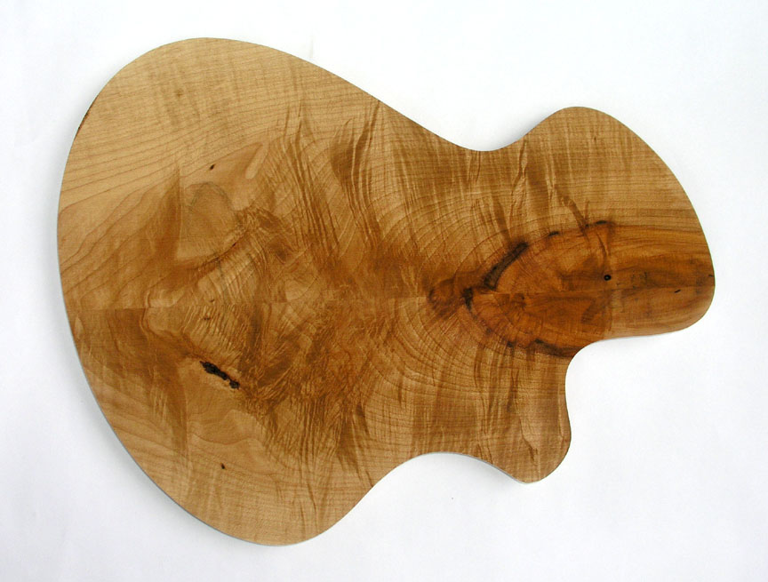 Here are a couple of new and available tops, each ready for me to build you a Proteus model guitar to your own specifications. Contact me as soon as possible, if you're interested. Either will be an absolutely stunning Proteus. And since either is not yet laminated onto a back of any kind, you can specify your choice of back wood, as well. At this stage, I can cut out the pickup cavities with a scroll saw to use as pickup covers in a technique similar to the one I used on